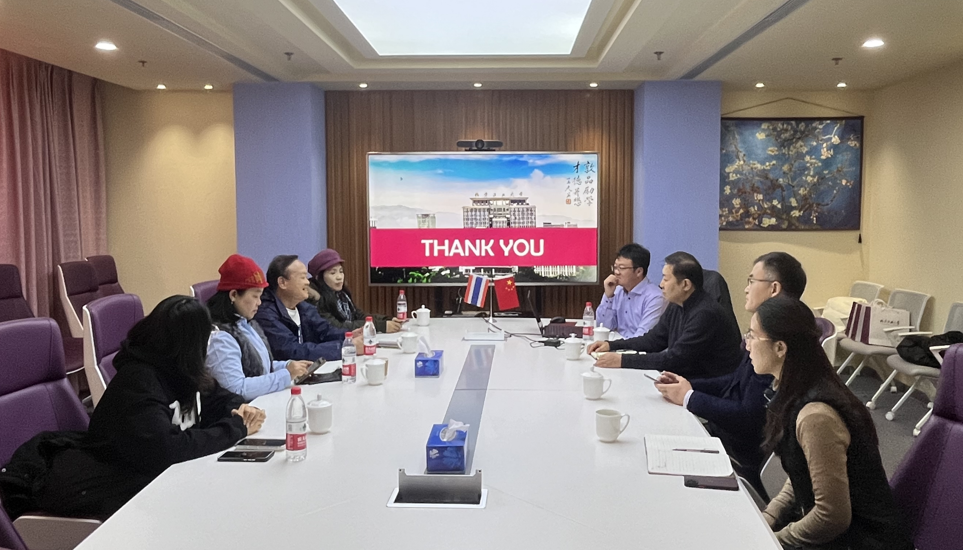 韩飞对来宾表示欢迎,他介绍了公司的基本概况及国际化办学情况,表示两校在学科设置方面有很多相近的专业,希望两校通过短期访学、交换生、双学位等项目形式开展校际合作,推动师生的深入交流,通过两校教育和科研的合作赋能“中泰一家亲”和“人类命运共同体”新的时代内涵发展。